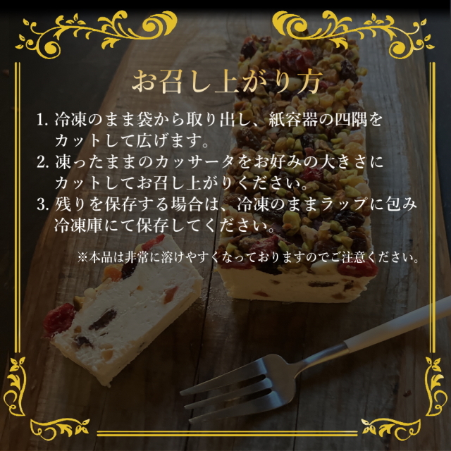 2. 凍ったままのカッサータをお好みの大きさにカットしてお召し上がりください。