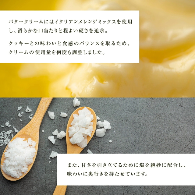 バタークリームにはイタリアンメレンゲミックスを使用し、 滑らかな口当たりと程よい硬さを追求。 クッキーとの味わいと食感のバランスを取るため、 クリームの使用量を何度も調整しました。 また、甘さを引き立てるために塩を絶妙に配合し、味わいに奥行きを持たせています。