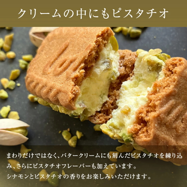 シナモンの効いたの味と食感のバランスにこだわったクリーム そして、独特のねっとりとした歯ごたえと芳しい甘い香りのピスタチオ それぞれの良さがが消えないように試行錯誤の末たどり着いた 「ピスタチオにまみれたバターサンド」是非ご堪能ください。