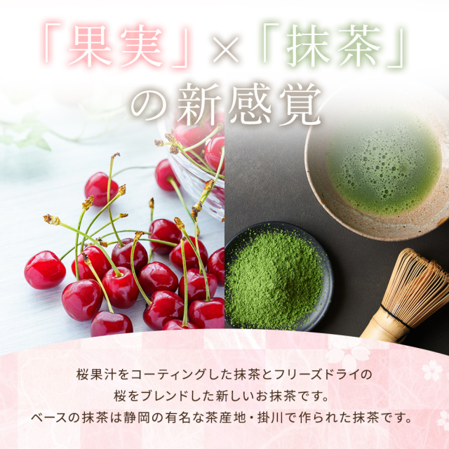 桜果汁をコーティングした抹茶とフリーズドライの桜をブレンドした新しいお抹茶です。