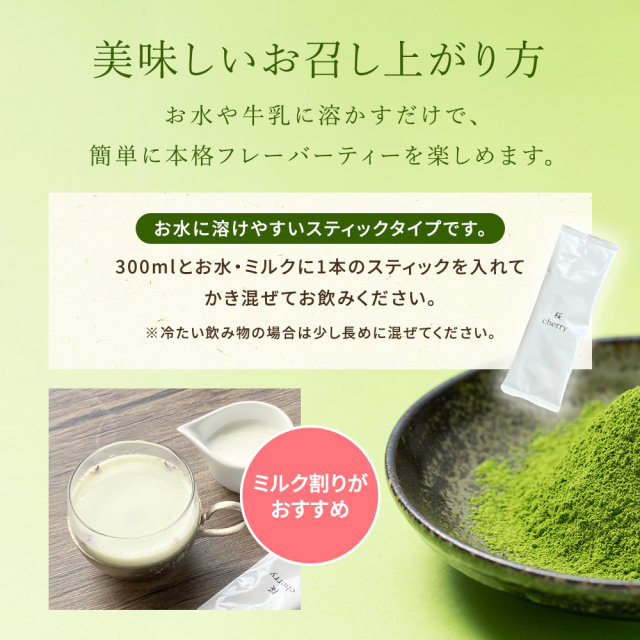 チェリーと桜の葉の風味が抹茶のほろ苦さと重なり、桜餅を思わせる後味に。