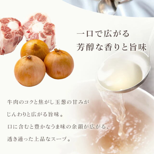 日本を代表するフランス料理の一流シェフ「三國清三」監修 澄んだ旨味に、牛肉とローストオニオンの旨味を丁寧に引き出した本格スープです。