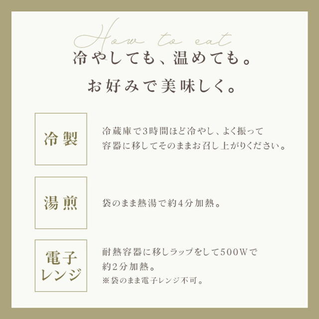 シンプルでありながら奥深い味わいの上品なスープは、冷やしてはもちろん、温めても美味しくお召し上がりいただけます。